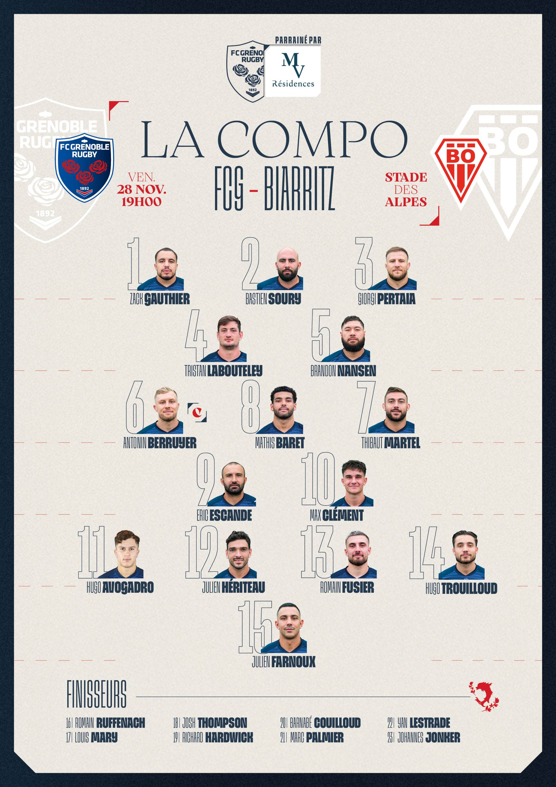 MV Résidences vous présente la compo’ du FCG pour sa 12e journée de championnat, au Stade des Alpes, face à Biarritz !