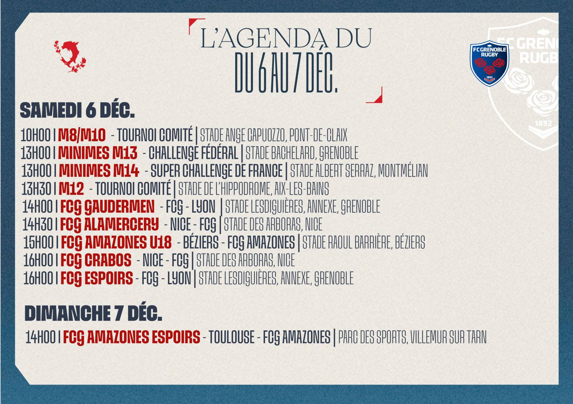 × Fermer la vidéo Le 2 déc. 2025 L'agenda du week-end ! < Article précédent LE NOUVEAU SITE DU FCG SHOP EST EN LIGNE ! Article suivant Grenoble Logistique Distribution vous livre les arbitres de la 13e journée de ProD2 > Découvrez l'agenda du week-end ! Photo : K.Valentin Auteur : FCG Rugby Facebook Twitter Google+