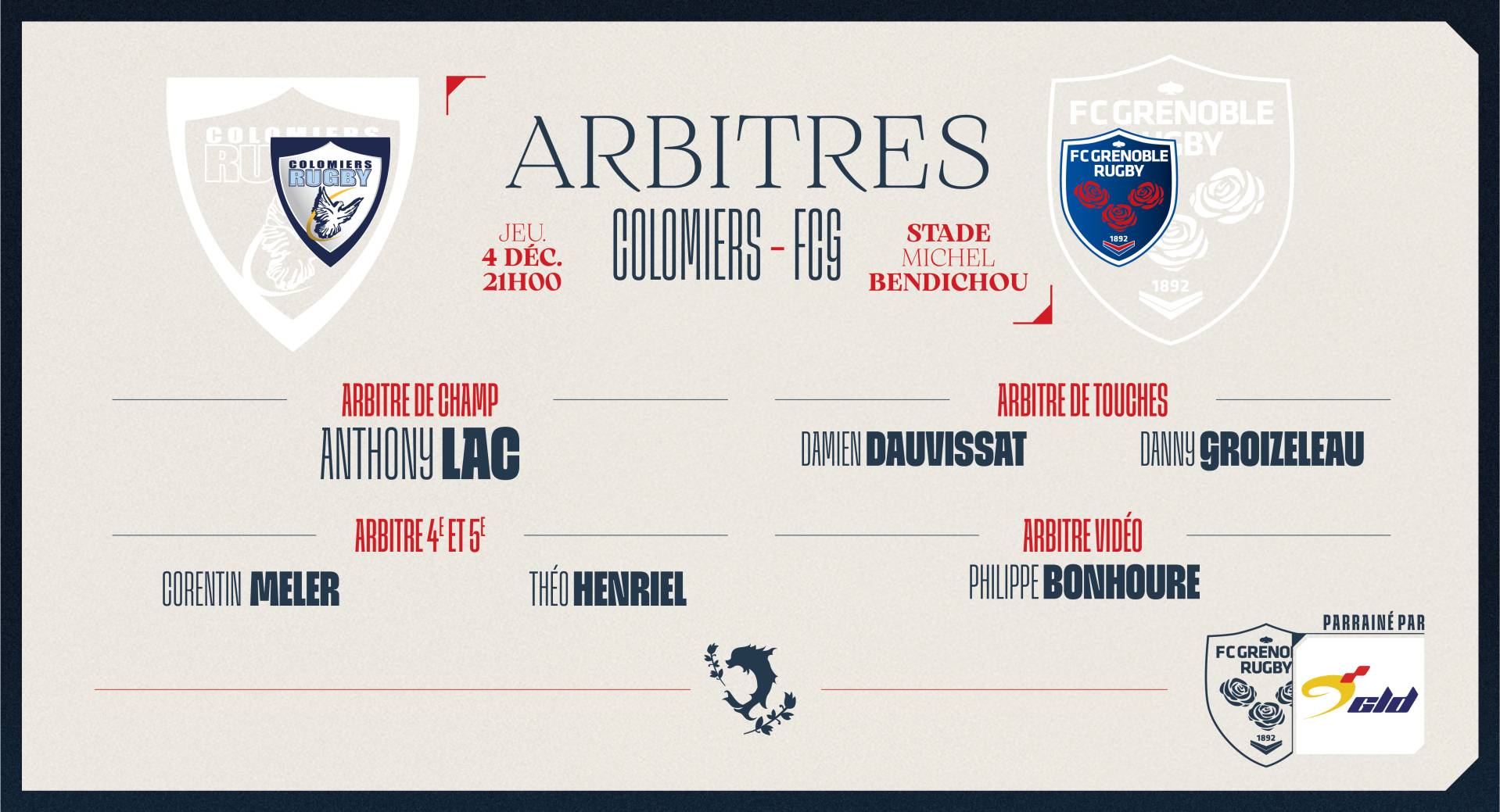 Grenoble Logistique Distribution vous livre les arbitres de la 13e journée de ProD2, pour laquelle le FCG va à Colomiers, ce jeudi 4 décembre à 21H !