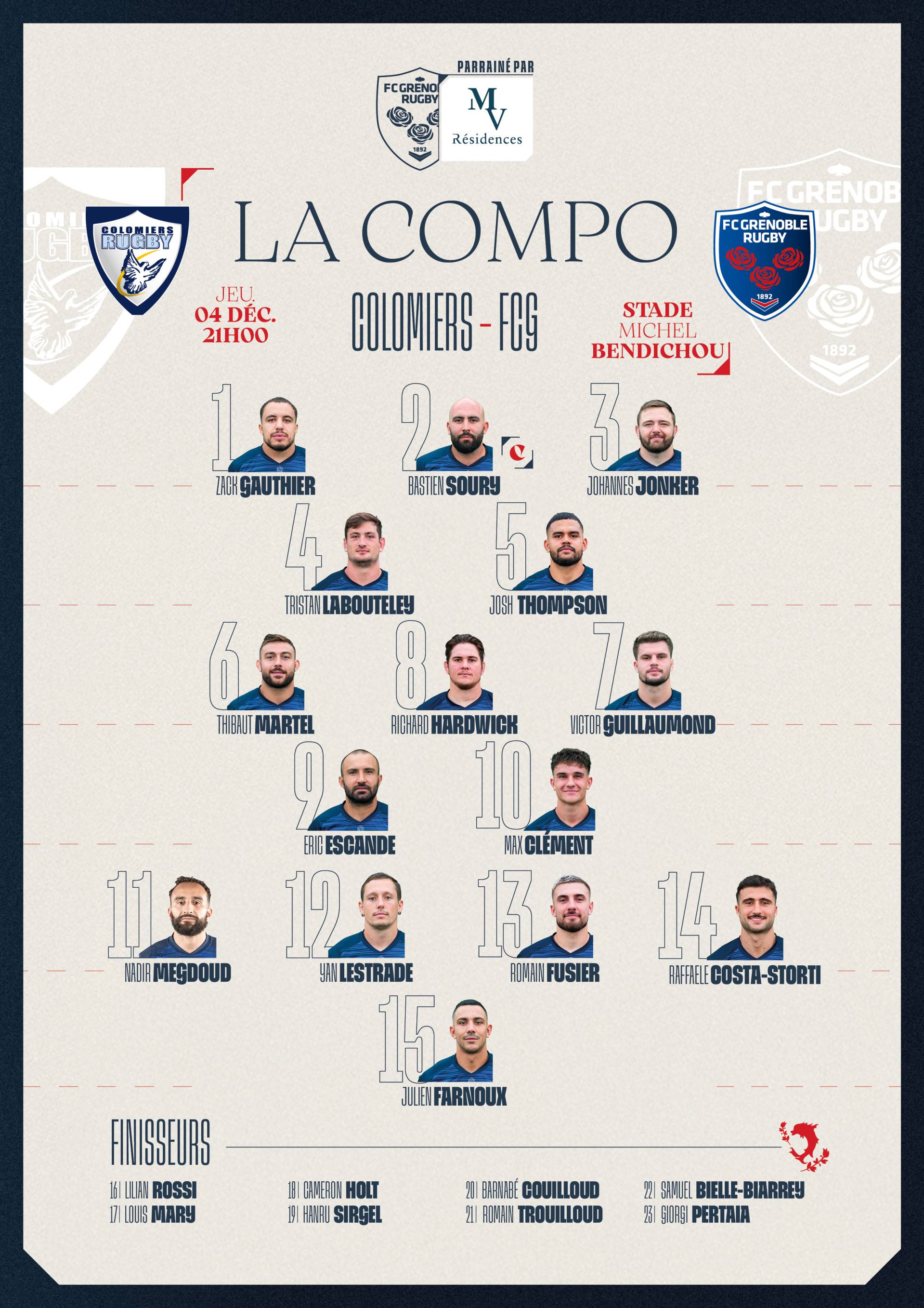MV Résidences vous présente la compo’ du FCG pour sa 13e journée de championnat, au Stade Michel Bendichou à Colomiers et sur Canal+ Sport !