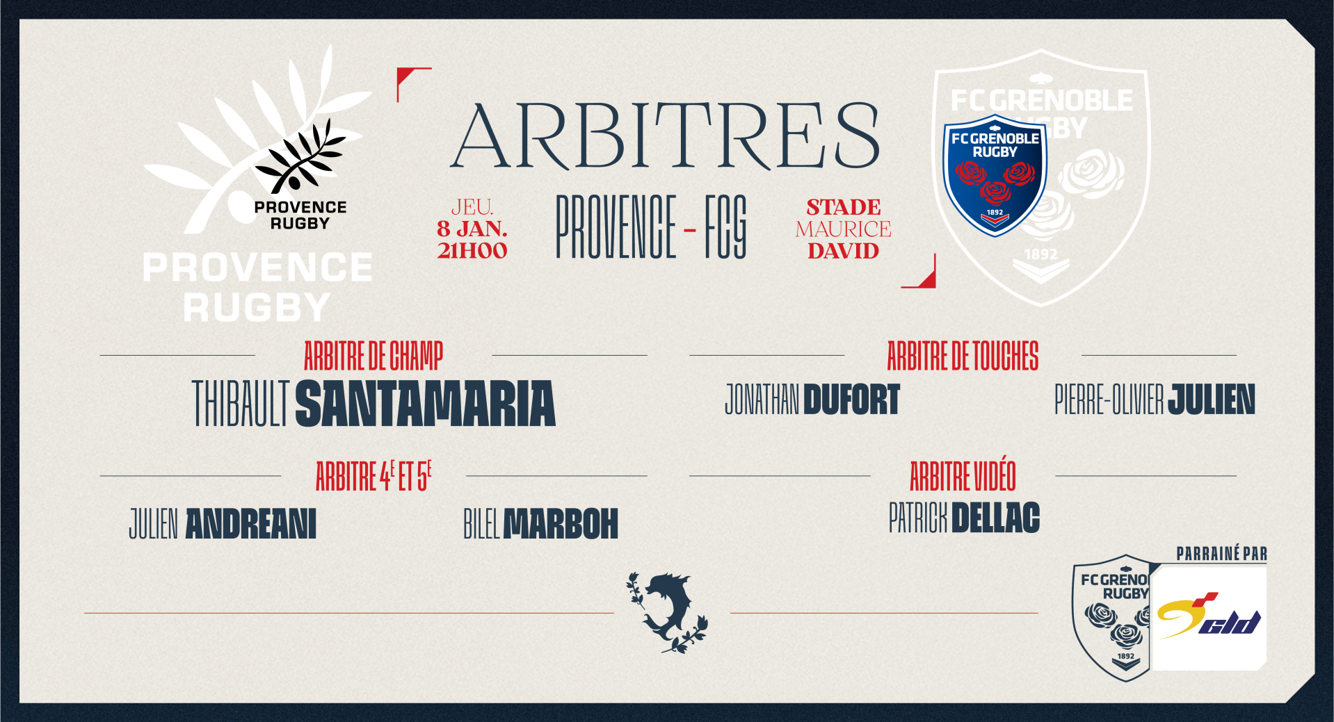 Grenoble Logistique Distribution vous libre les arbitres de la 16 journée de ProD2, pour laquelle le FCG va à Aix-en-Provence, ce jeudi 8 janvier à 21h au Stade Maurice David et sur Canal+ Sport !