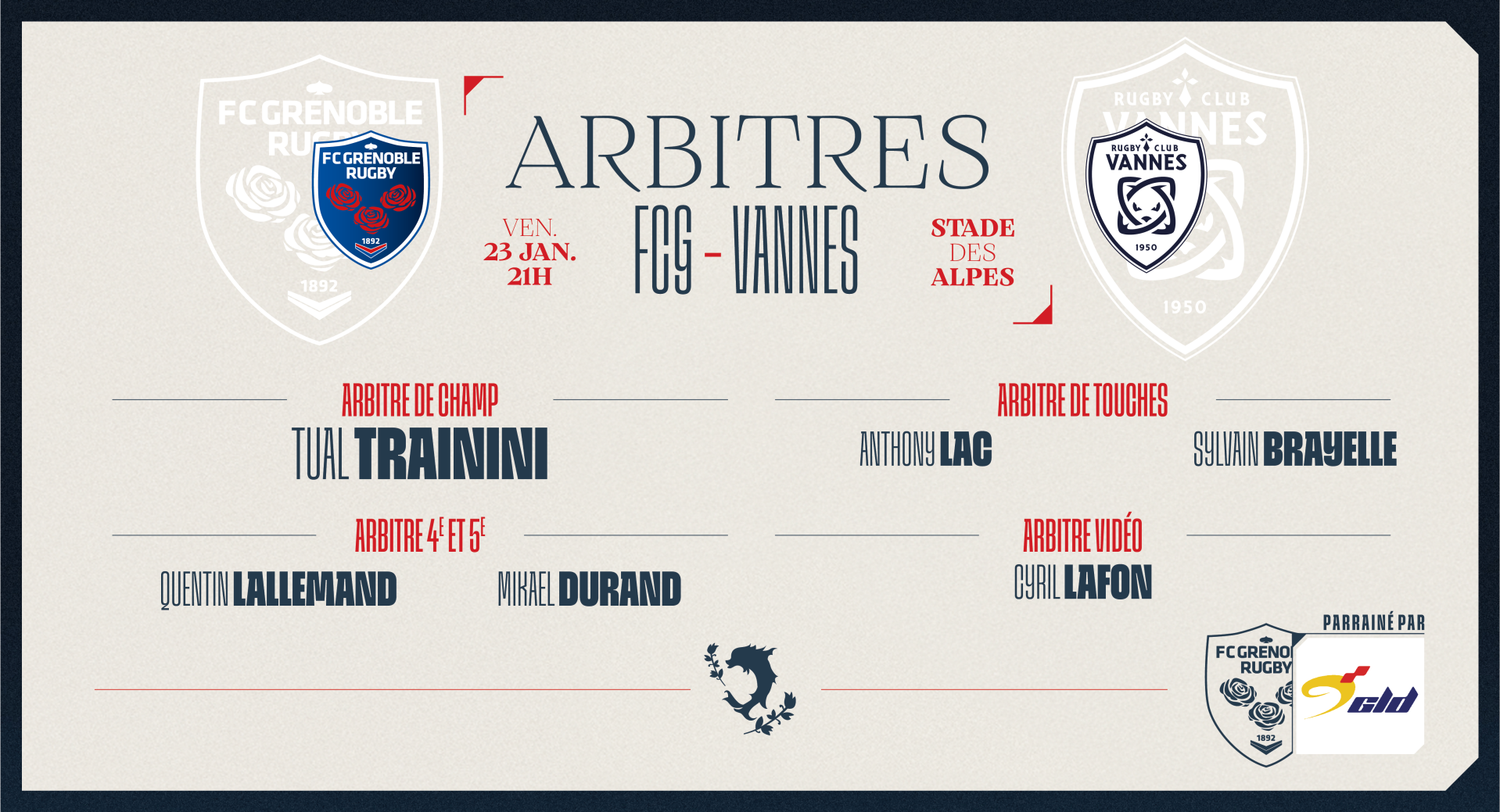 × Fermer la vidéo Le 21 janv. 2026 Grenoble Logistique Distribution vous livre les arbitres de la 18e journée de ProD2 < Article précédent L'agenda du week-end ! Article suivant James Fender (Ospreys) sera grenoblois la saison prochaine > Grenoble Logistique Distribution vous livre les arbitres de la 18e journée de ProD2, pour laquelle le FCG reçoit Vannes, ce vendredi 23 janvier à 21h au Stade des Alpes ! https://www.gld.fr Auteur : FCG Rugby Facebook Twitter Google+