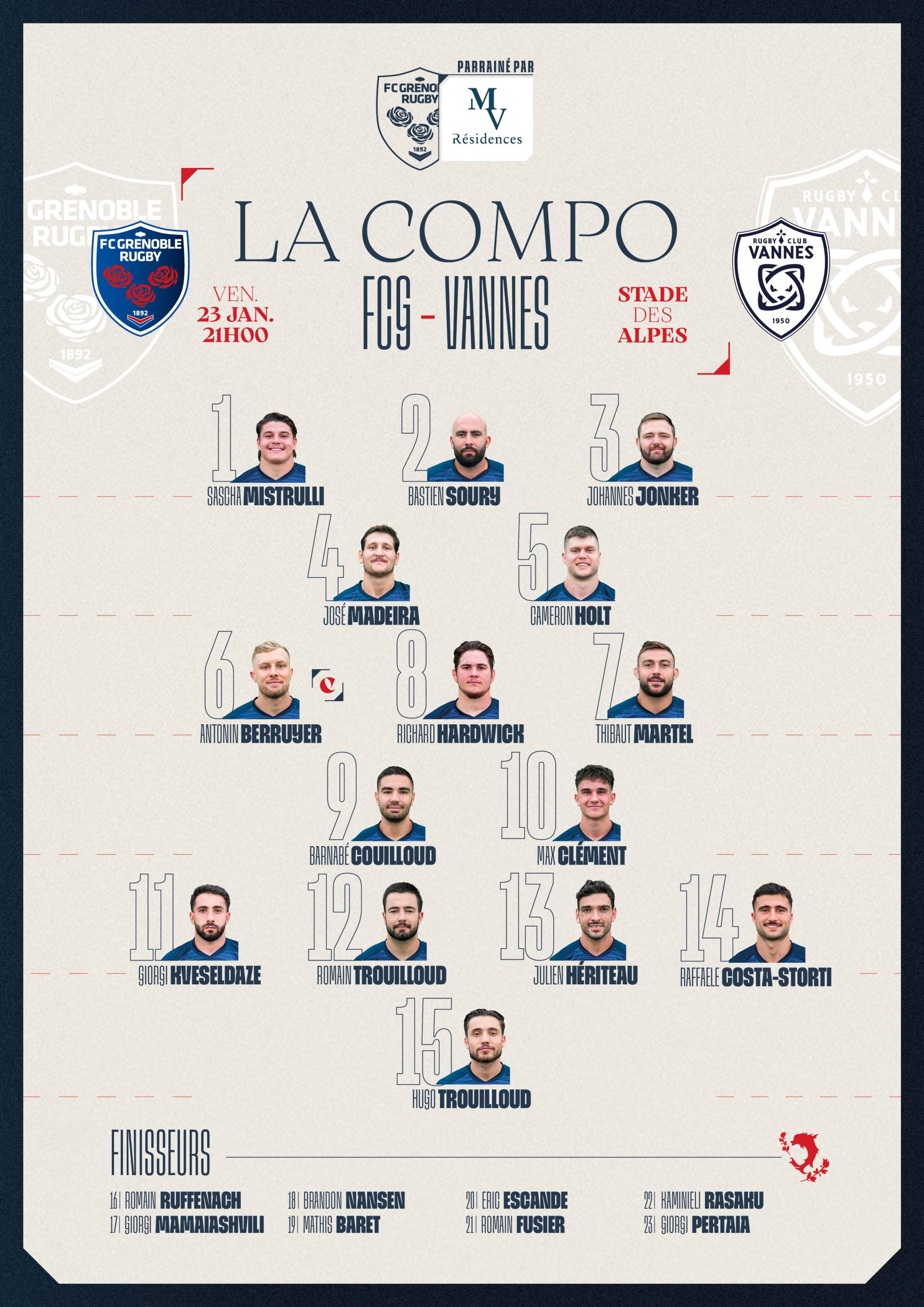 MV Résidences vous présente la compo’ du FCG pour sa 18e journée de championnat, face à Vannes, au Stade des Alpes !