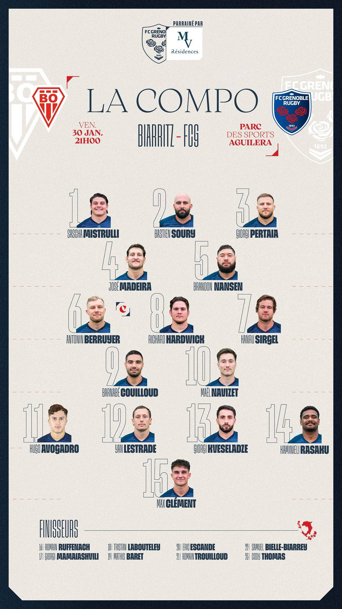 MV Résidences vous présente la compo’ du FCG pour sa 19e journée de championnat, à Biarritz, au Parc des Sports Aguilera et sur Canal+ Sport !