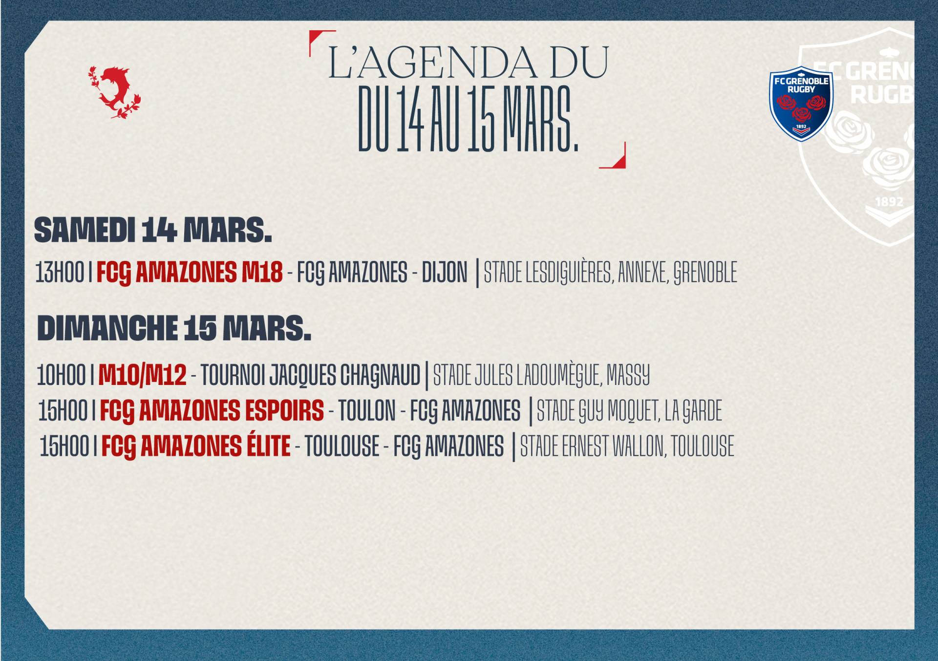 × Fermer la vidéo Le 11 mars 2026 L'agenda du week-end ! < Article précédent Les résultats du week-end ! Article suivant pack derby : vivez les deux derby d'avril à -20% ! > Découvrez l'agenda du week-end ! Photo : K.Valentin Auteur : FCG Rugby Facebook Twitter Google+