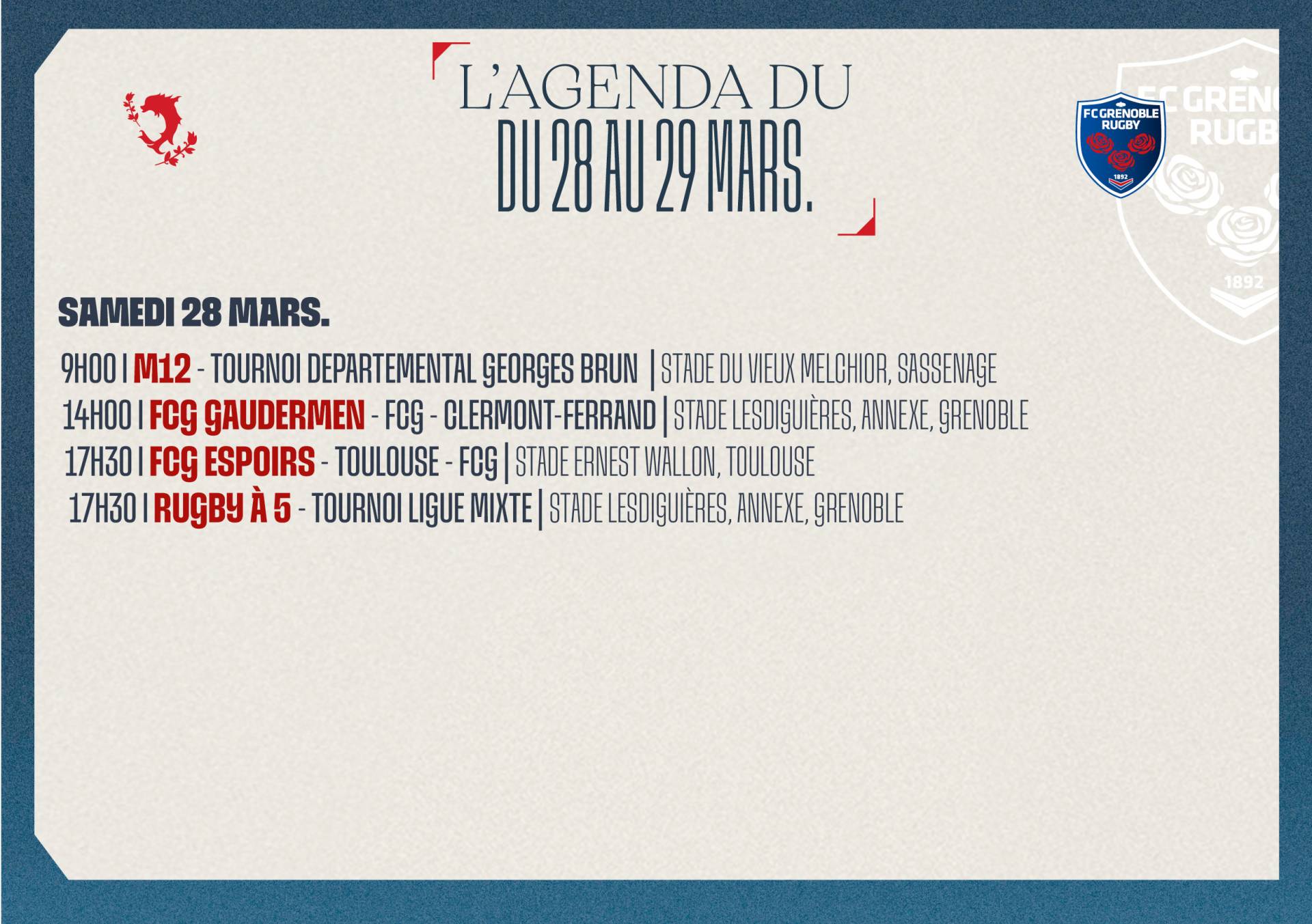 × Fermer la vidéo Le 25 mars 2026 L'agenda du week-end ! < Article précédent Les résultats du week-end ! Découvrez l'agenda du week-end ! Photo : K.Valentin Auteur : FCG Rugby Facebook Twitter Google+
