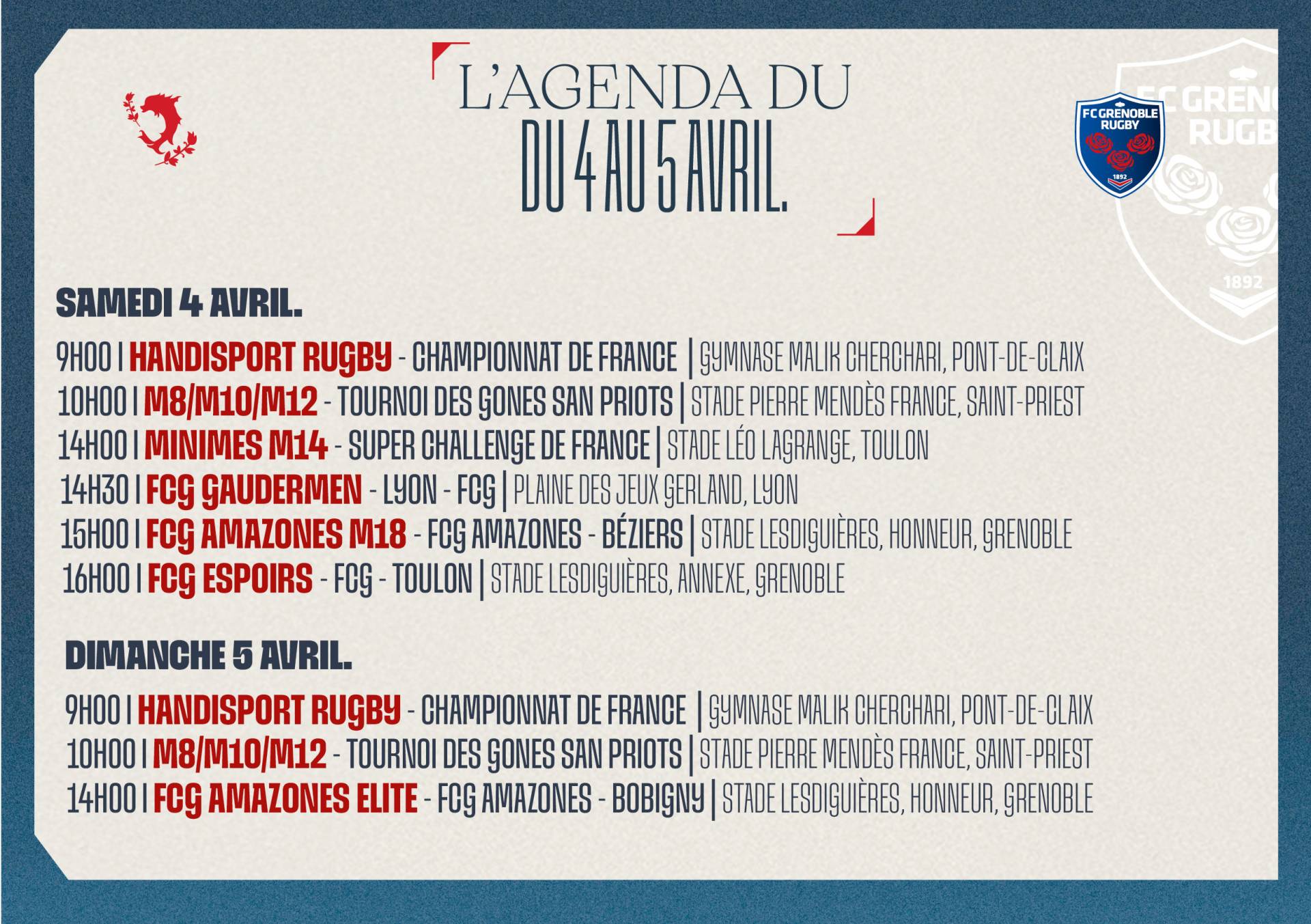 × Fermer la vidéo Le 1 avr. 2026 L'agenda du week-end ! < Article précédent Les infos pratiques | FCG - VRDR Découvrez l'agenda du week-end ! Photo : K.Valentin Auteur : FCG Rugby Facebook Twitter Google+