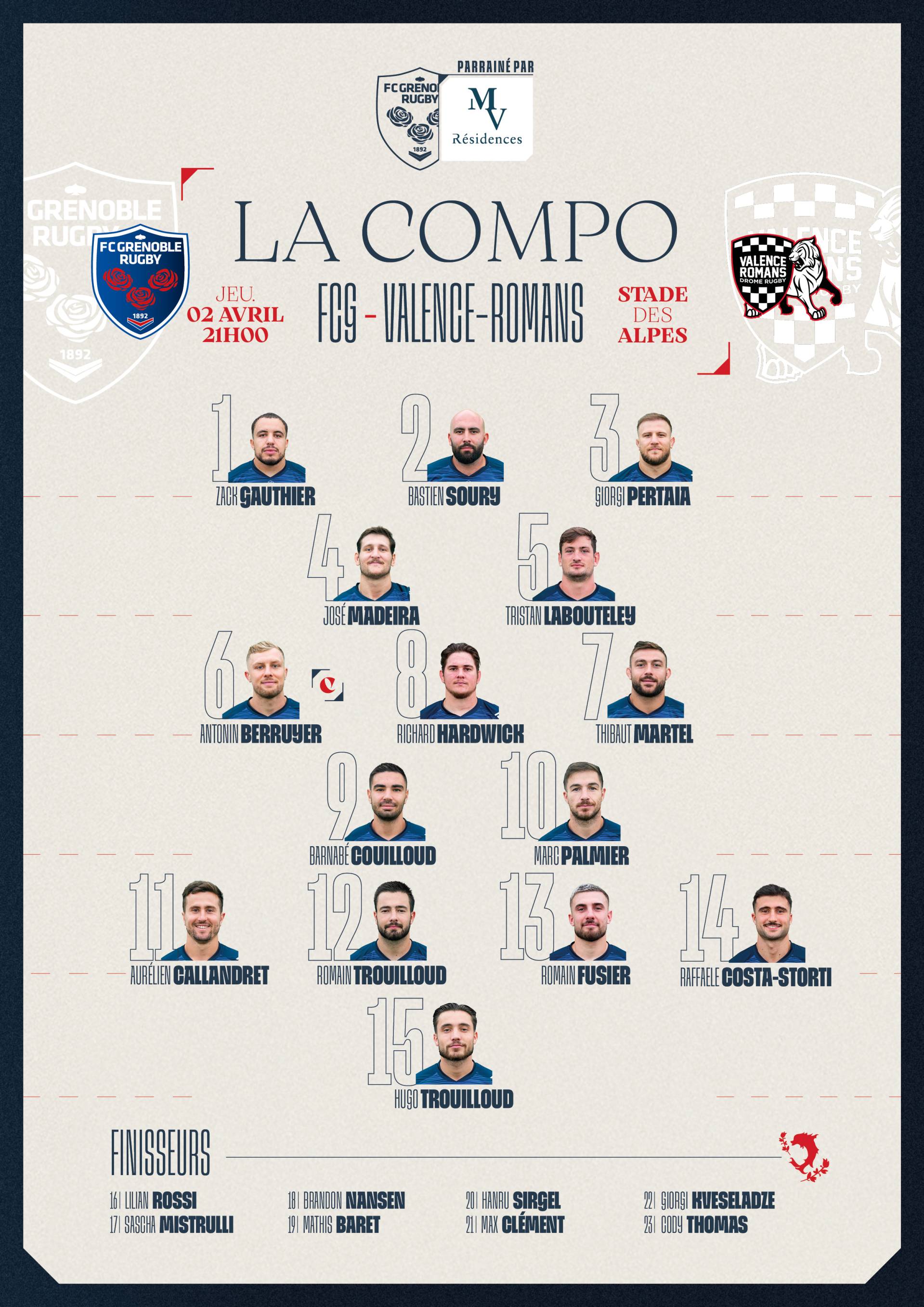× Fermer la vidéo Le 1 avr. 2026 La compo' du FCG face à Valence-Romans ! < Article précédent Grenoble Logistique Distribution vous livre les arbitres de la 25e journée de ProD2, /uploads/media/gallery_image/0001/35/thumb_34259_gallery_image_big.jpeg Auteur : FCG Rugby Facebook Twitter Google+